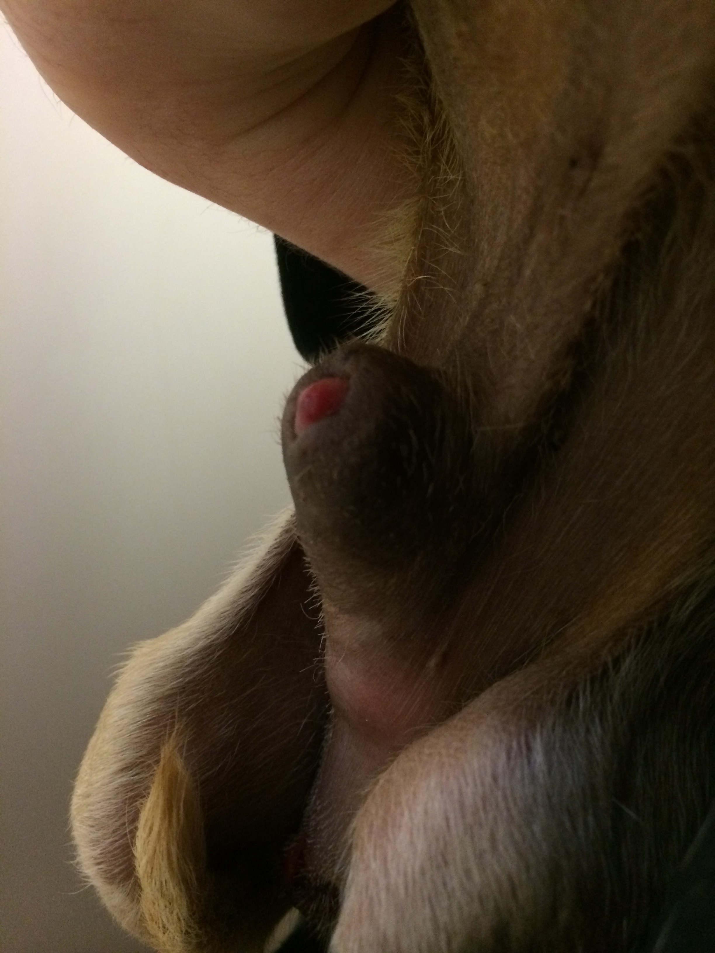 It’s an awkward problem. It’s also often misunderstood. Many people see a dog with paraphimosis (par′ă-fī-mō′sis) and think the dog is sexually aroused. While any male dog may normally (even without sexual arousal) extend his penis beyond the sheath or prepuce that normally covers his penis, the penis should be able to retract back within the prepuce and out of sight without any difficulty. When that doesn’t happen, we have a problem. Paraphimosis is the term we use when a dog’s penis is unable to fully retract back within the prepuce. The first paraphimosis case I cared for was a chihuahua. His penis was stuck outside of the prepuce, but fortunately it simply appeared dry. Some dogs with paraphimosis may develop swelling, strangulation of the tissue, infection or necrosis. This dog was lucky.