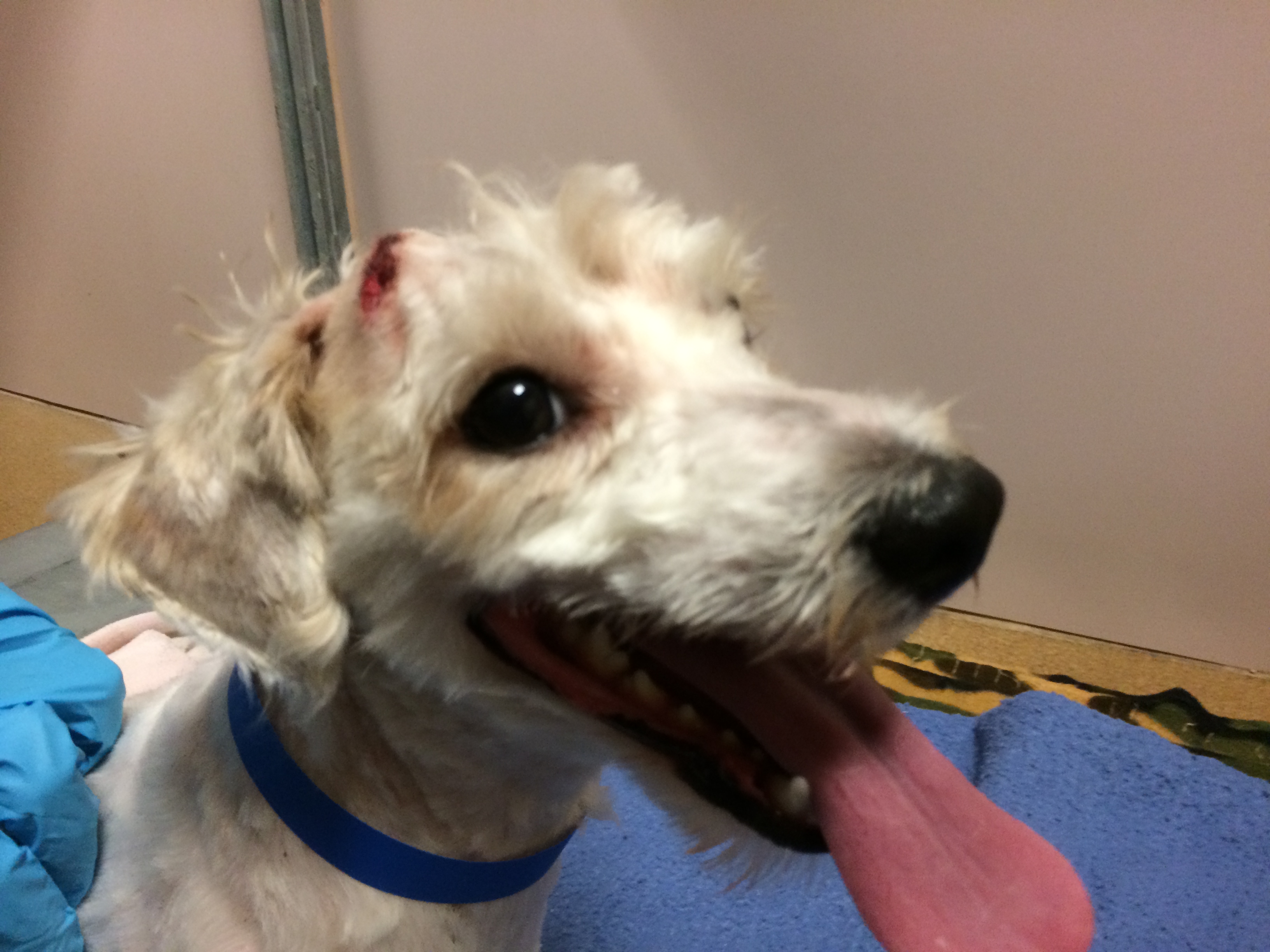 You might not be able to see it, but this dog had a large, pendulous mass hanging down over his right eye (it might look like an ear to you). His matted coat obscured much of the mass, but it was sizable and clearly in the way.