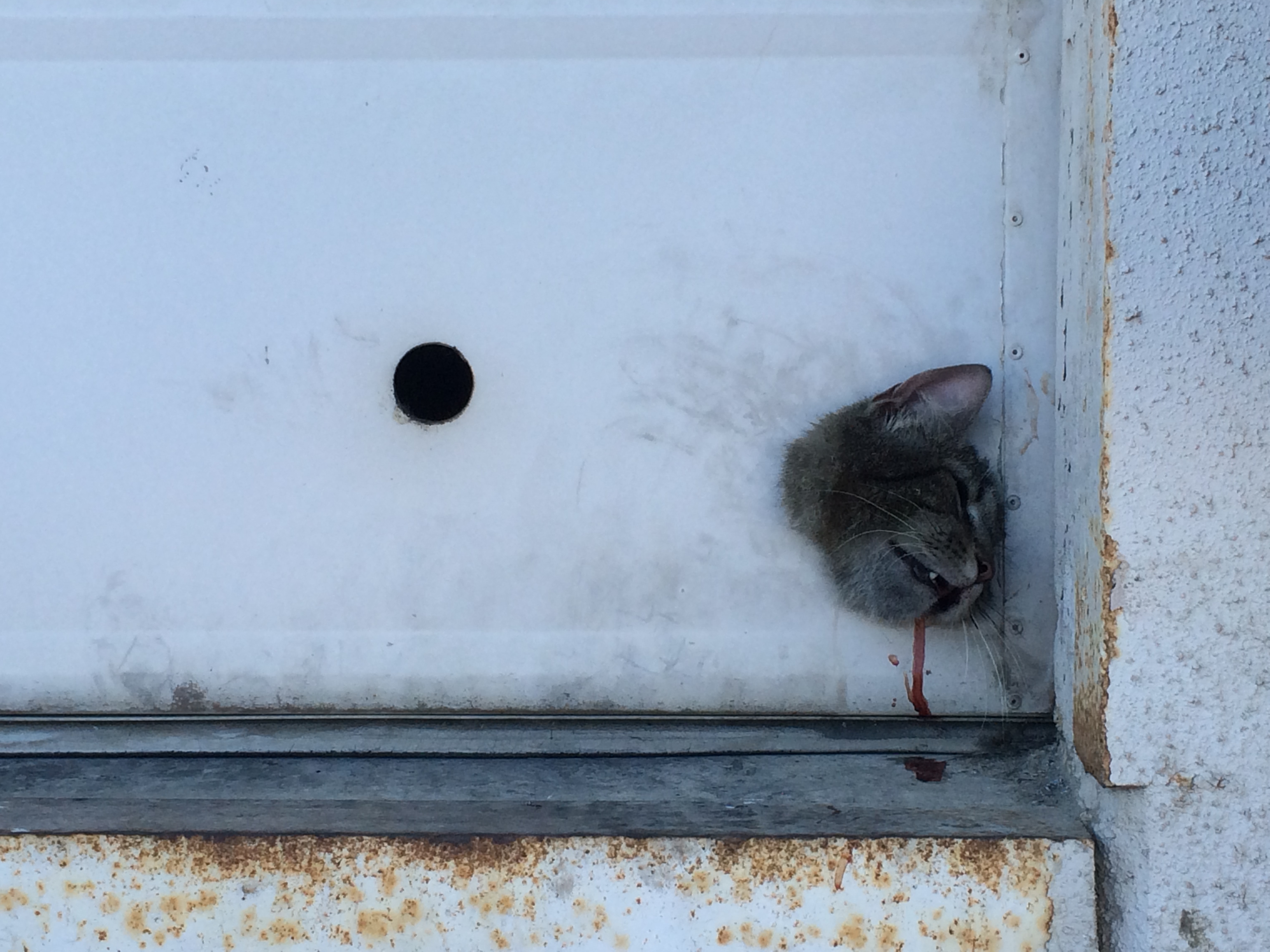 We moved outside and around the building to gauge how the cat looked on the other side. Unfortunately, he looked even worse on the other side. His head was wedged very tightly within the hole, and he had blood in his mouth. A streak of dried blood also ran down the door, and a small spot of blood resided on the ledge below his head.