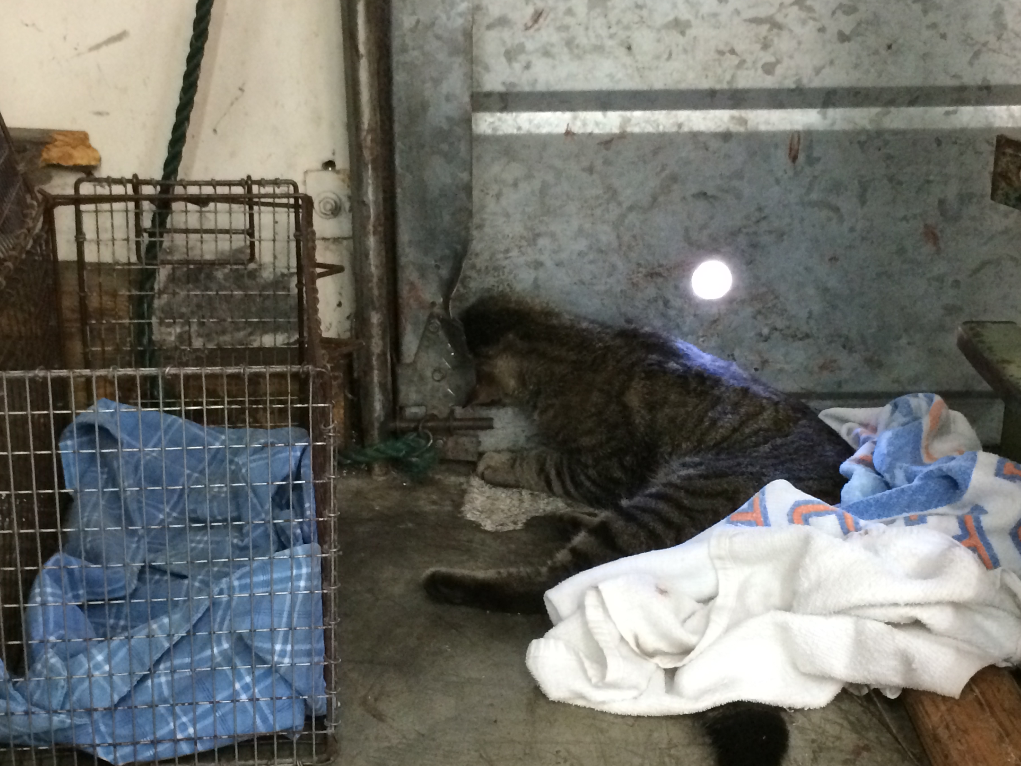 On the morning of June 24, 2014, I arrived to the shelter and before I could even put my things down, I was immediately notified that the Animal Services Officers would be needing my assistance in the field. A cat, presumably feral, had gotten its head trapped in a very small hole in a large metal door on the side of a metal shop in San Jose.